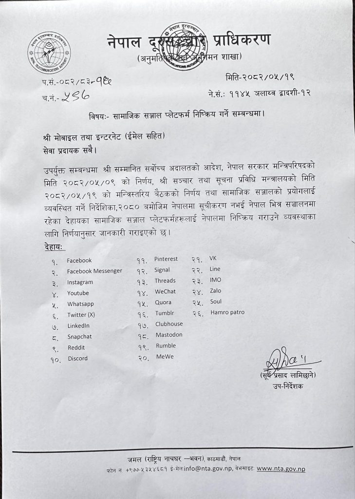 The move follows a directive from the Supreme Court, which, while hearing a contempt of court case, had ordered the government to ensure that no social media platform operates in Nepal without formal registration. In compliance, the Cabinet decided on August 25 to issue the notice.